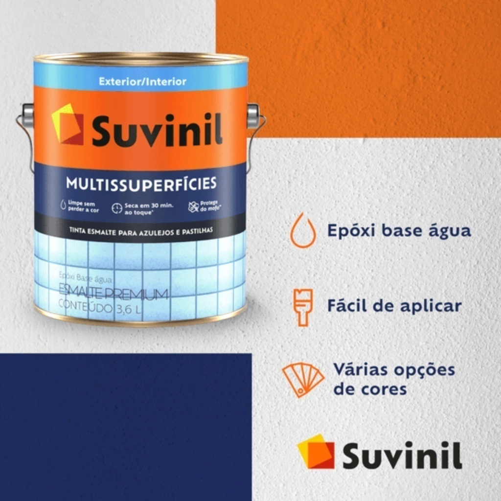 A Tinta Esmalte Suvinil Multissuperfícies é indicada para superfícies de madeira, metal, azulejo, pastilha, vidro e alvenaria, tanto em ambientes internos quanto externos.